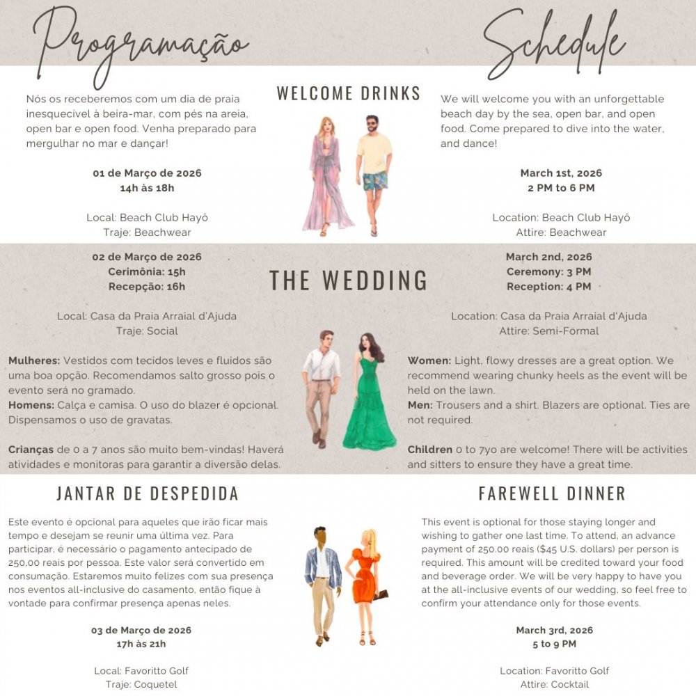 We created this website to share the details of our wedding planning with you. In the Travel Guide section, you'll also find a complete travel guide with useful information on how to get to the event location, accommodation, transportation, beauty salons, and much more to help you plan your trip.